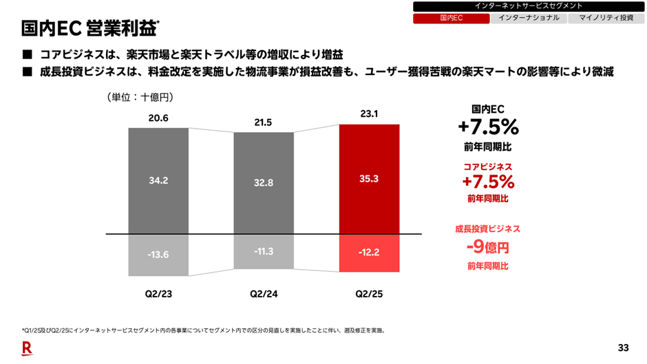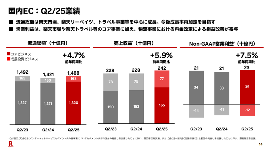 2025年第2四半期において、インターネットサービスセグメント全体の売上収益は3,245億円で、前年同期比+6.8%の成長となりました。Non-GAAPベースの営業利益も191億円と、安定した利益水準を維持しています。注目すべきは、国内EC流通総額が前年同期比+4.7%と回復基調にあることです。2024年度は年間で▲1.5%のマイナス成長でしたが、2025年に入り第1・第2四半期ともにプラス着地となっています。