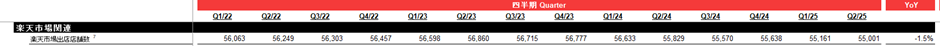 まず注目すべきは、楽天市場の出店店舗数の推移です。2023年Q2の56,860店舗をピークに減少傾向が続き、2025年Q2時点では55,001店舗まで減少しました。この背景には、一定の売上基準を満たさない店舗への退店促進や、競争激化に伴う自主的な撤退があると考えられます。楽天としては、取扱商品数や選択肢の多様性を確保する上で、今後は新規出店の支援やメーカー誘致が課題となるでしょう。