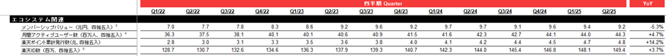次に、楽天エコシステム全体におけるアクティブユーザー数とID数の伸びにも注目が必要です。2025年Q2の月間アクティブユーザー数は4,430万人(前年比+4.7%)、楽天ID数は1億4,940万(前年比+3.7%)と、伸び率が鈍化しています。EC流通総額の伸び率とほぼ同等であることから、ユーザーの購買頻度や単価に大きな伸びが見られていないことが示唆されます。今後の中長期的な投資判断において、このユーザー数の推移は重要な指標になると考えられます。