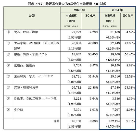 物販分野で最大のカテゴリーは「食品・飲料・酒類」です。市場規模は3兆1,163億円で前年から6.36%増加しており、EC化率は4.52%でした。コロナ禍をきっかけに食料品をネットで購入する習慣が定着し、総合スーパーやネットスーパーが成長を牽引しています。店舗出荷とセンター出荷を組み合わせたハイブリッド型のネットスーパーが増加し、サブスクリプション制や生鮮食品の強化によって利用頻度と客単価の向上を図る動きも見られます。2024年上旬にはサプリメントで健康被害が報じられ、一時的な不安が広がりましたが、高齢者のEC利用増加や生活習慣病予防ニーズの高まりが支えとなり、市場は依然として拡大傾向にあります。