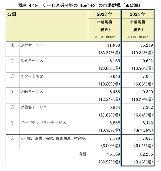 サービス系分野では旅行・飲食・金融などのカテゴリーが回復基調を強め、2024年の市場規模は8兆2,256億円で前年より9.43%増加しました。旅行サービスのBtoC‑EC市場は3兆5,249億円で約10%伸び、国内旅行がコロナ前水準の9割程度まで回復したことに加え、訪日外国人消費が過去最高を記録したことが追い風となりました。スマートフォン利用やオンライン予約が主流となった半面、対面サービスの価値を見直す動きもあり、オンラインと対面の併用が顧客体験を左右していると言えます。