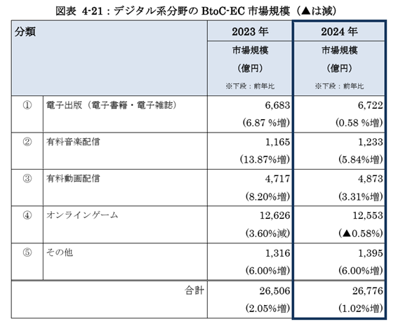 物販系のBtoC‑EC市場は15兆2,194億円で、前年から3.70%増加しましたが、2020年以降に見られる成長鈍化傾向が続いているとも報告されています。サービス系分野は8兆2,256億円となり、前年から9.43%増と3分野の中で最も伸び率が高い結果でした。一方、デジタル系分野は2兆6,776億円で前年比1.02%増と小幅な増加にとどまり、成長は穏やかです。