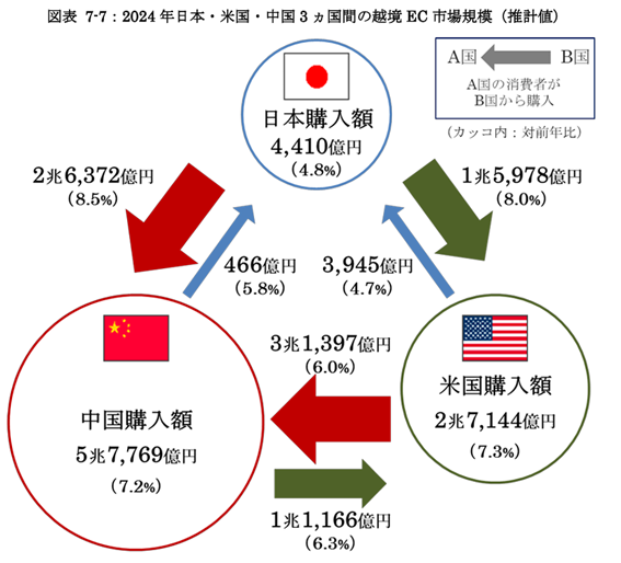 日本・米国・中国3か国間の越境BtoC‑EC市場規模をみると、日本から米国・中国向けが4,410億円で、そのうち米国経由が3,945億円、中国経由が466億円でした。一方、米国から日本・中国向けは2兆7,144億円、中国から日本・米国向けは5兆7,769億円と、海外から日本への流入がはるかに大きい現状が示されています。日本の消費者は海外の製品やコンテンツへの関心が高く、逆に国内の事業者が海外市場を開拓する余地は大きいと考えられます。特に日本文化やコンテンツに関心の高い地域に向けた越境ECでは、商品の魅力や品質保証、配送の信頼性が成否を分けるでしょう。