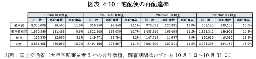 再配達率は消費者の在宅率向上や置き配サービスの普及で改善しており、都市部でも2019年の16.6%から2024年には11.6%まで低下しました。しかしトラックドライバーの労働時間規制強化に起因する「2024年問題」により輸送力不足が懸念されており、政府は物流革新に向けた政策パッケージを策定し、適正運賃の収受やデジタル化、多様な輸送モードの活用などを推進しています。事業者も輸送網の集約や共同配送、予約の前倒しなど効率化に取り組んでおり、今後も物流分野の改革が続く見通しです。