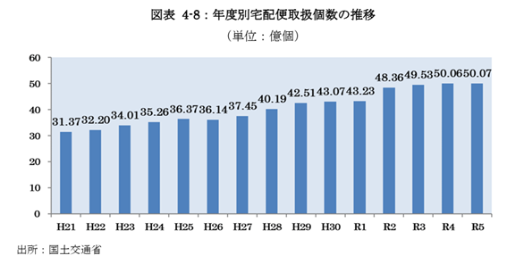 物販系ECの拡大に伴い、宅配便取扱個数は2023年度に50億733万個と高水準を維持しました。しかし、2024年の取扱個数は前年とほぼ横ばいで伸びが鈍化していると報告されています。大手3社以外の事業者や個人によるラストワンマイル配送網の拡大が宅配需要を下支えしている一方、アマゾンなど大手企業の自社配送拠点拡充により業界構造は変化しつつあります。