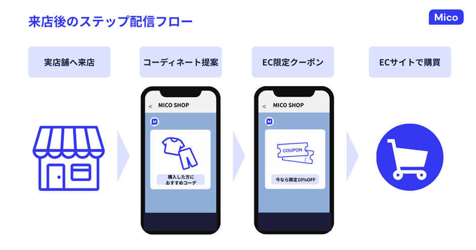店舗への来店をトリガーとして、自動でLINEメッセージを配信する仕組みです。LINEログインを店舗の来店時に行うことで、会員情報を自動連携させ、ECサイトで使えるクーポンを配布したり、ログイン不要でECで購入できる導線を提供したりすることで、EC購買を促進します。