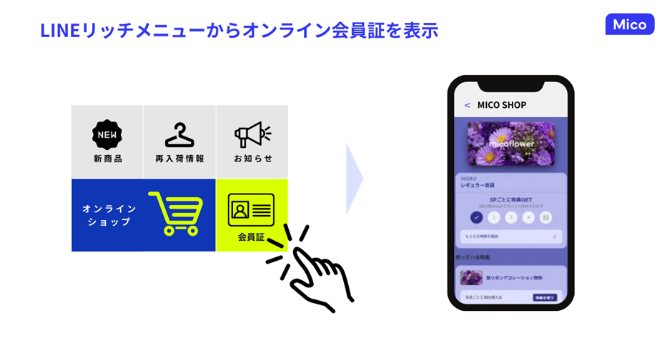 「紙の会員証を財布から取り出すのが手間」「また来店するかわからないのにアプリをインストールするのは面倒」というライトユーザー向けにLINEのデジタル会員証はリピート率を高める上でも有効です。だれもがスマホにインストールしているアプリ「LINE」を活用し、お客様はレジでLINEミニアプリの会員証をQRコードでかざして登録するだけで、ポイントを貯めることができます。同時に、そのお客様はブランドのLINE公式アカウントに自動的に登録され、ECショップ限定のお得な情報やクーポンを送ることも可能です。