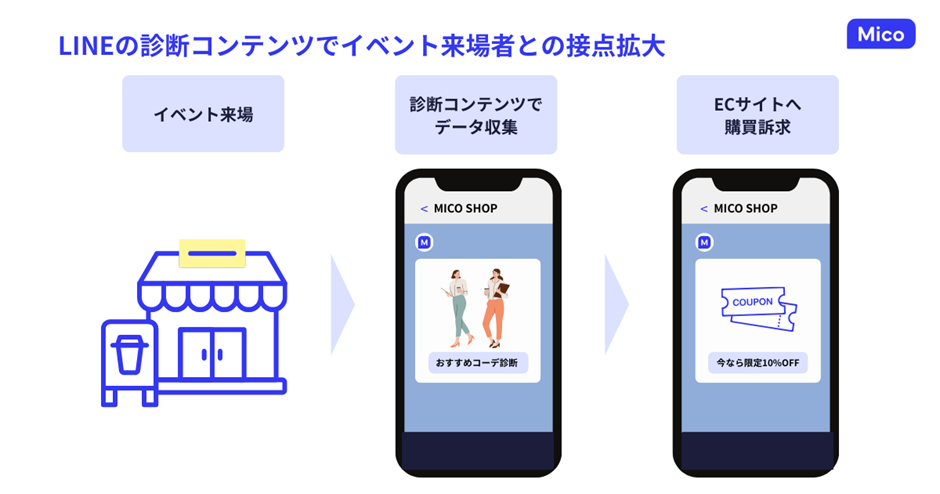 イベントやPOP UPショップのような「一見さん」のお客様が多い場には「診断コンテンツ」をきっかけに登録促進することがおすすめです。診断コンテンツを進めるうえでユーザーが入力した情報を、その後のLINE公式アカウントの配信に活かすことができます。顧客自身の興味・関心といった一次情報を回答してもらえる可能性が非常に高いので、お客様と中長期的な関係を続けるCRM施策を考えやすくなっています。