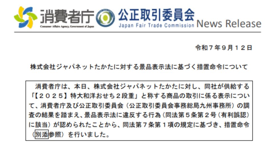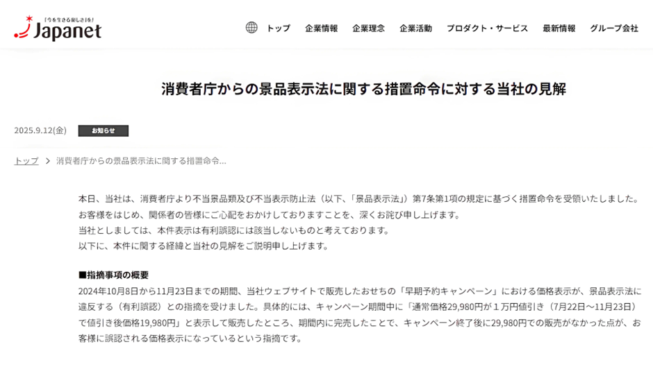 2025年9月12日、EC業界に大きなニュースが飛び込んできました。消費者庁が、大手通販企業の株式会社ジャパネットたかたに対し、景品表示法(以下、景表法)に違反するとして措置命令を下したのです。誰もが知る同社が厳しい行政処分を受けたという事実は、多くの事業者に衝撃を与えました。(出典:消費者庁/ジャパネットたかたに景品表示法違反で措置命令)