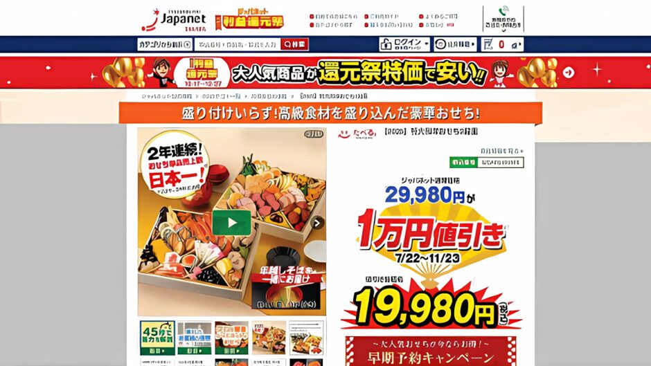 具体的には、2024年10月から11月にかけて実施された「早期予約キャンペーン」での価格表示が問題視されました。サイト上では「ジャパネット通常価格29,980円が」「1万円値引き」され、「値引き後価格19,980円」になると大きく表示されていました。(出典:ジャパネットたかた、「大人気おせちが今ならお得」の表示で措置命令)
