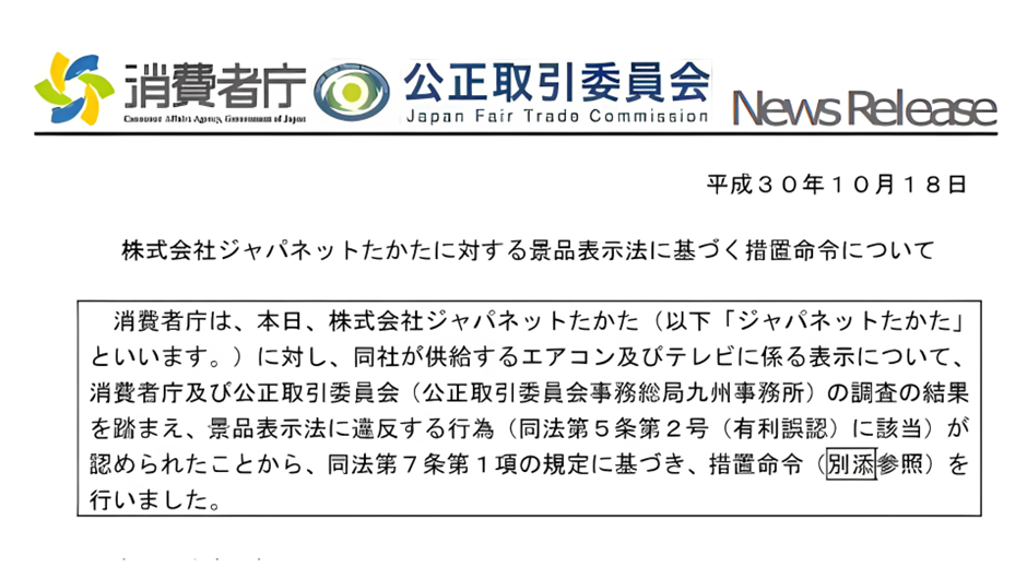 実は、ジャパネットたかたが景表法で指摘を受けるのは初めてではありません。過去にはエアコンなどの価格表示でも措置命令や課徴金納付命令を受けており、規制当局が価格表示の適正化へ厳しく臨む姿勢の表れとも考えられます。(出典:ジャパネットたかた 二重価格表示で消費者庁の措置命令)