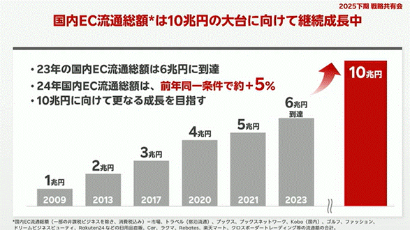 楽天市場はこれまでも繰り返し、中長期的な目標として「国内EC流通総額10兆円」の達成を掲げてきました。かつては2030年を達成目標としていましたが、近年は表現を「中長期での達成」とやや柔らかく修正しており、慎重姿勢も見え隠れします。