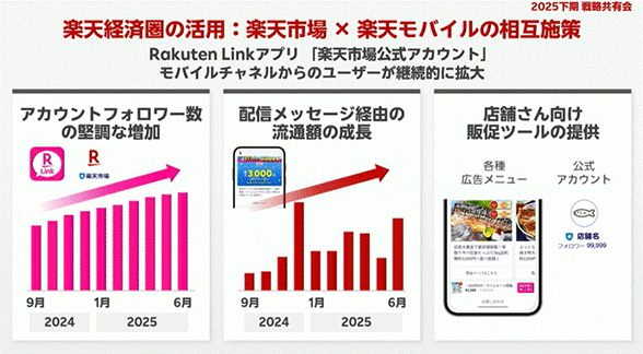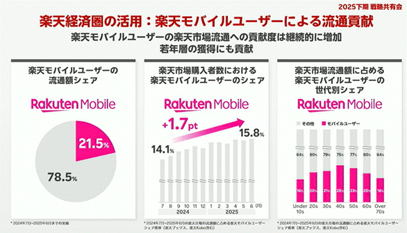 楽天モバイルユーザーによる流通総額は全体の21.5%を占めており、前年比で+1.7ptの増加を記録しています。これは通信×ECのシナジーを活かした楽天らしい成長モデルの一環であり、今後のさらなる拡大が期待されています。