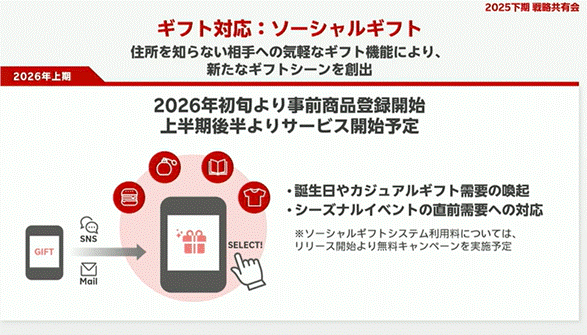 贈り先の住所を知らなくてもギフトを贈れる「ソーシャルギフト」機能は、2026年上期に本格導入予定。機能としては先行他社に追随する形ですが、ユーザー認知度の向上には時間がかかるため、商品ページでの解説や訴求が重要となるでしょう。