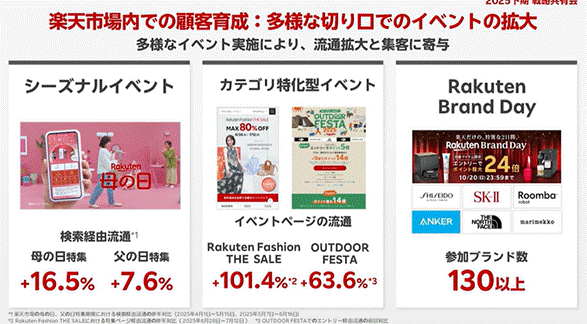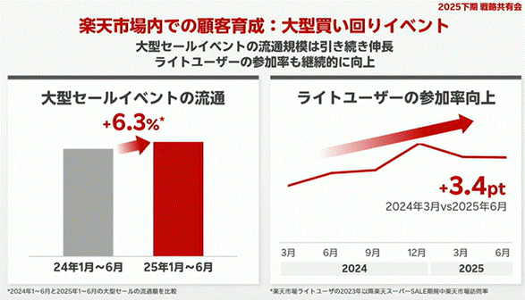 楽天市場におけるスーパーSALEやお買い物マラソンといった大型イベントは、引き続き流通拡大の最重要ドライバーとして位置づけられています。特にモバイルユーザーの参加率や新規顧客の流入増加が顕著で、イベント施策の最適化が売上成長に直結します。