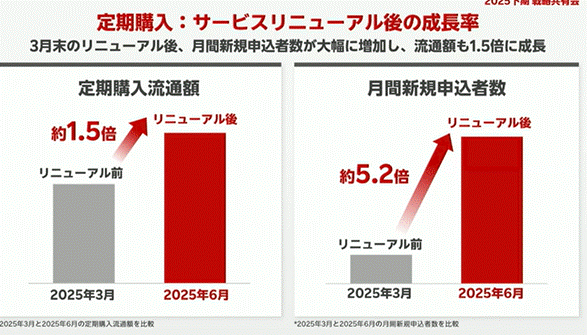 2025年3月末に定期購入機能が刷新され、流通総額はリニューアル前の1.5倍に増加。新規申込者数は5.2倍にまで伸長しました。SPU対象外であったキャンペーンを適用可能にするなど、利便性向上の工夫が成果に直結した形です。