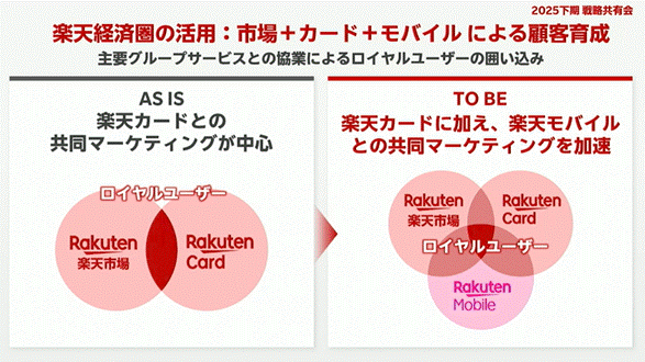 これまで楽天市場の成長を支えてきたのは、楽天カードとの連携による購買促進でした。しかし近年は、楽天モバイルユーザーとの連携強化に注力しはじめています。楽天市場の購入者のうち約7割が楽天カードを利用している一方、モバイル経由の流通総額も着実に拡大しており、新たな顧客育成の柱と位置づけられています。