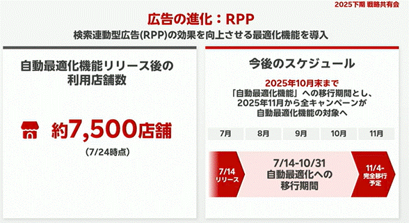 RPP広告では、2025年7月より自動最適化機能の導入が始まりました。導入店舗数は約7,500店。11月には自動移行も予定されており、これによる広告配信ボリュームの増減が発生する可能性があるため、事前に運用状況の精査が必要です。