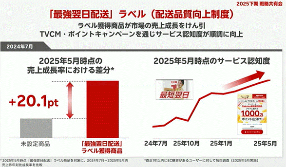 「最強翌日配送」ラベルを取得している商品群は、非対応商品と比べて+20.1ptの成長差を記録。検索結果上でも優遇されるようになっており、今後さらに導入が進む見込みです。