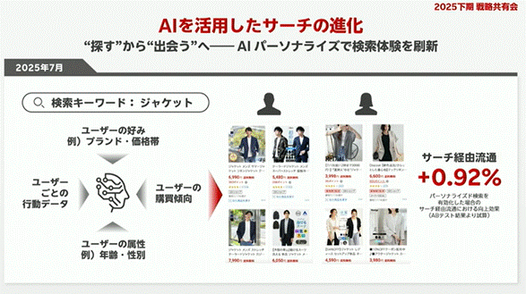 2025年上期に導入されたパーソナライズド検索では、検索経由の流通総額が+0.92%の改善を記録。数字としては控えめな印象ですが、今後の進化によって更なる成果が期待されます。