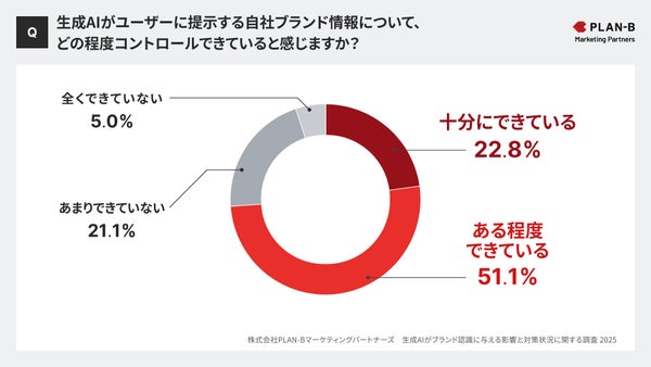 「生成AIがユーザーに提示する自社ブランド情報について、どの程度コントロールできていると感じますか?」という質問については、「十分にできている」22.8%、「ある程度できている」51.1%で、73.9%が一定の管理ができていると回答しました。