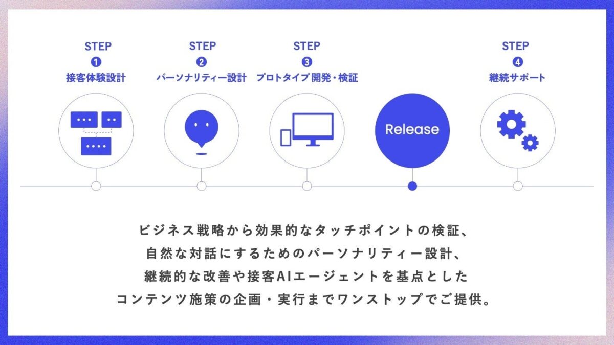 このソリューションは、接客AIエージェントの顧客体験を設計・開発していく中で、提供すべき体験価値の定義から始まり、パーソナリティの設計、プロトタイプの制作、開発の実装、運用・改善までを一貫して支援します。接客AIエージェントを中心に、顧客にとって最適な対話体験を提供し、ますます高度化・複雑化する顧客のニーズに応えることを目指しています。