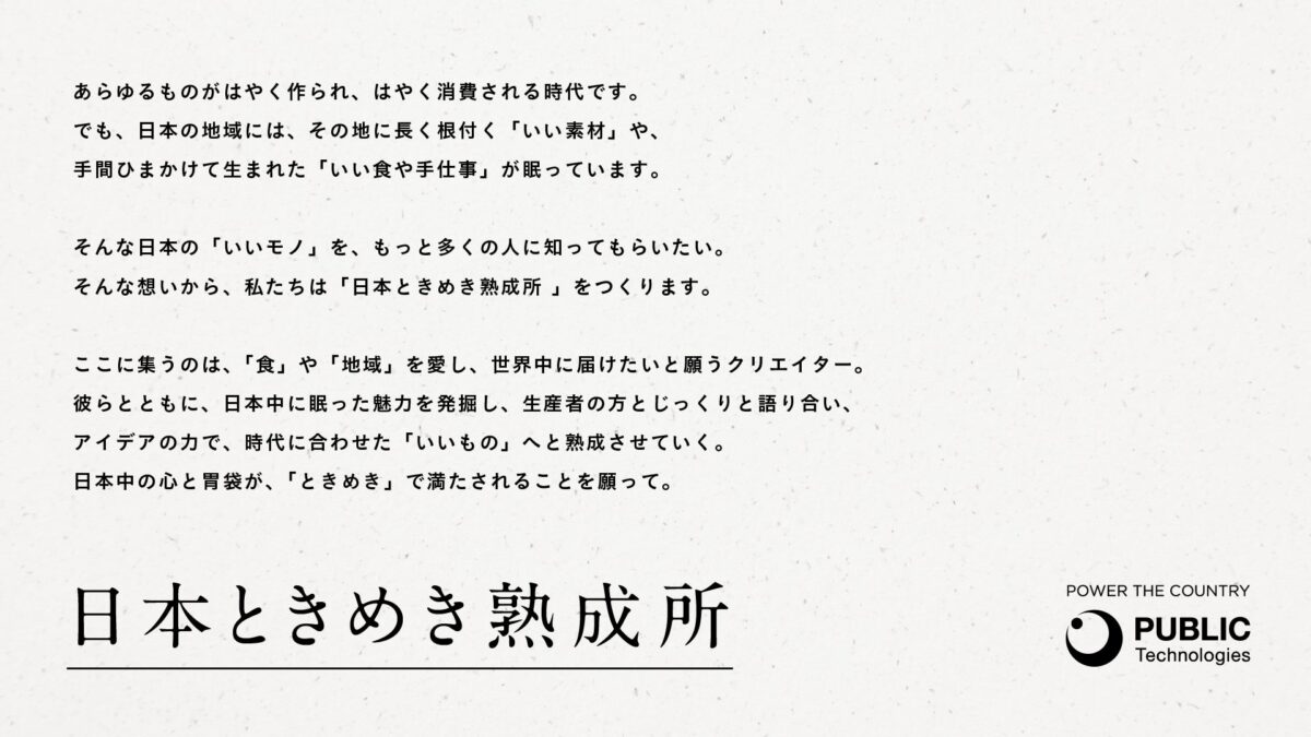 このような状況を踏まえ、パブリックテクノロジーズ社は生産者の「想いを形にする力」とクリエイターやインフルエンサーの「共感を広げる力」を結び付け、新たな価値の循環を生み出す仕組みが、日本を地域から躍動させるために不可欠だと判断し、本プロジェクトの立ち上げに至ったとしています。「日本ときめき熟成所」は、眠れる資産にアイデアと物語を添えて国内外へ届けることで、こうした課題の解決に挑戦します。