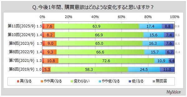 今後1年間の購買意欲が高くなると思う人は約9%。「変わらない」が6割強