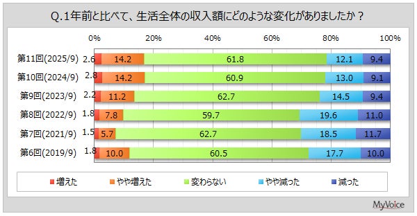 1年前より生活全体の支出額が増えた人は6割弱、2024年調査と比べて増加。収入額が増えた人は2割弱