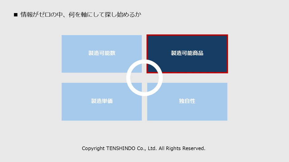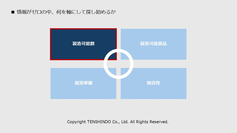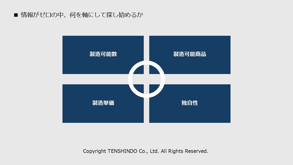 このうち、「製造単価」「独自性」は、検索軸(検索ワード)からは除外しましょう。
