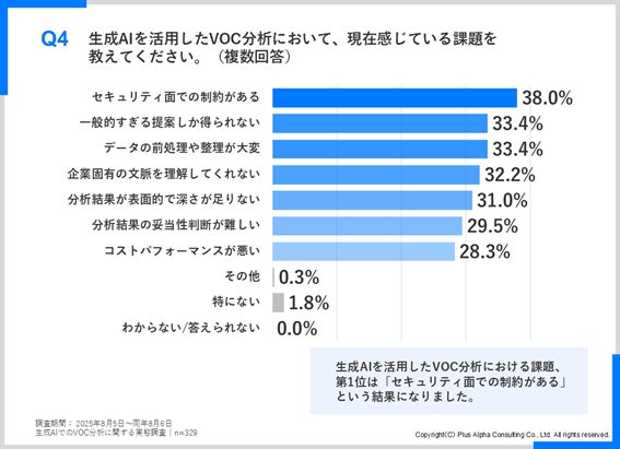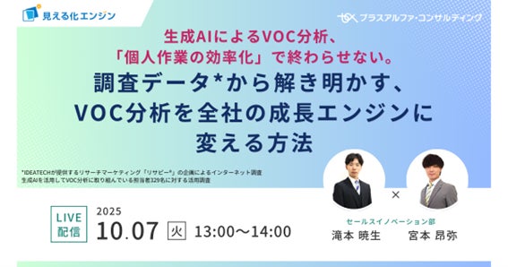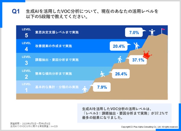 株式会社プラスアルファ・コンサルティング(本社:東京都港区、代表取締役社長:三室克哉)は、生成AIを活用したVOC(Voice of Customer:お客様の声)分析に関わる担当者329名を対象に「生成AIでのVOC分析に関する実態調査」を実施し、その結果を発表しました。