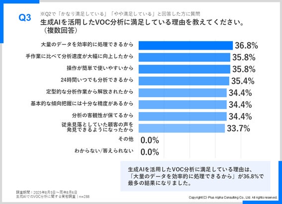 「かなり満足(26.1%)」、「やや満足(61.5%)」を合わせると87.6%が満足と回答しています。満足している理由としては、「大量のデータを効率的に処理できるから(36.8%)」「分析速度が大幅に向上したから(35.8%)」など、作業効率の改善に関するものが目立っています。その他、「分析の客観性が保てるから」「従来見落としていた顧客の声を発見できるようになったから」といった意見も見られます。