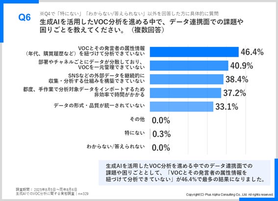 生成AIを活用したVOC分析のデータ連携面では、「VOCとその発言者の属性情報(年代、購買履歴など)を紐づけて分析できていない」という課題が最も多く、46.4%に上りました。次いで「部署やチャネルごとにデータが分散しており、VOCを一元管理できていない」(40.9%)、「SNSなどの外部データを継続的に収集・分析する仕組みを構築できていない」(38.4%)といった回答も上位にランクインしています。