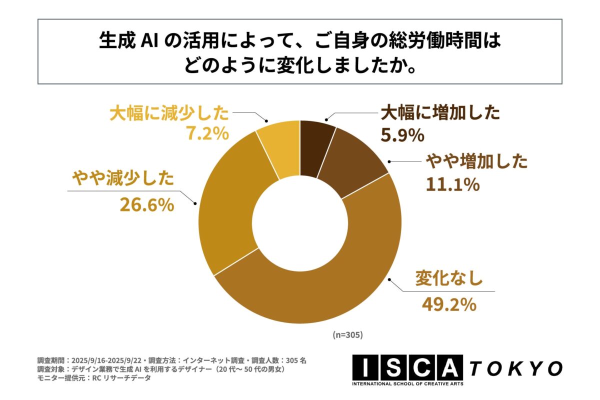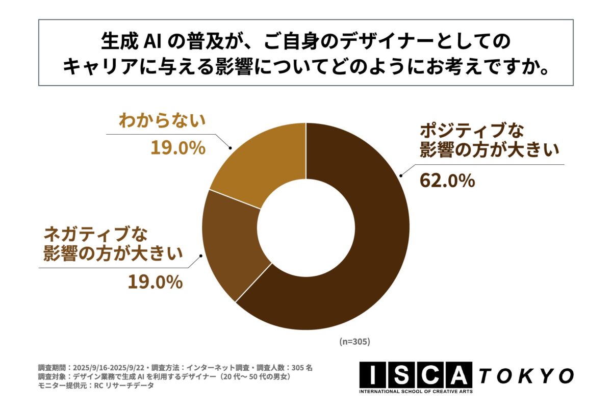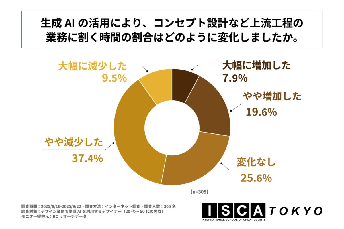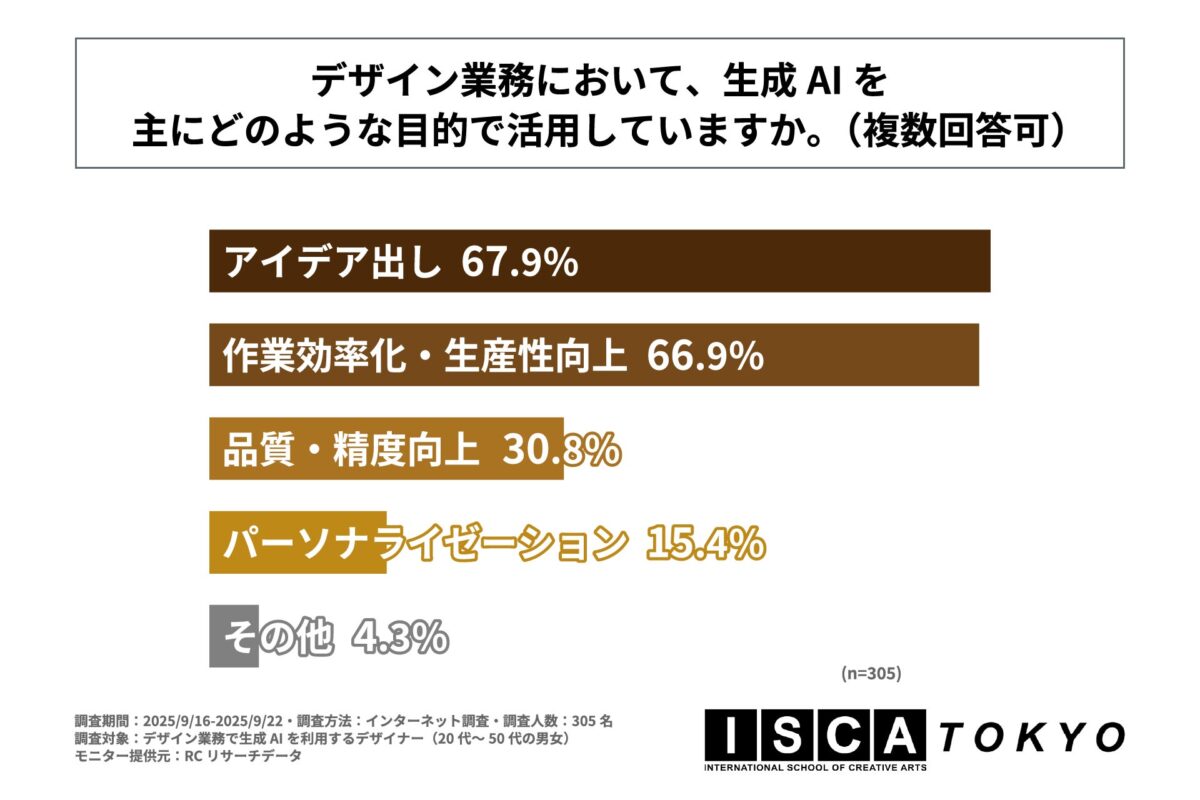 生成AIの普及により、デザイナーの役割は「作業実行者」から「コンセプト設計者」へとシフトし、スキルや生産性の格差を生み出しつつあります。この変化は個人のキャリアだけでなく、デザイン業界全体に大きな影響を与えていますが、現場のデザイナーが抱える具体的な意識や課題については明らかになっていませんでした。そこで「ISCA TOKYO」は、生成AIを業務で利用しているデザイナーを対象とした調査を実施し、その実態を明らかにしています。