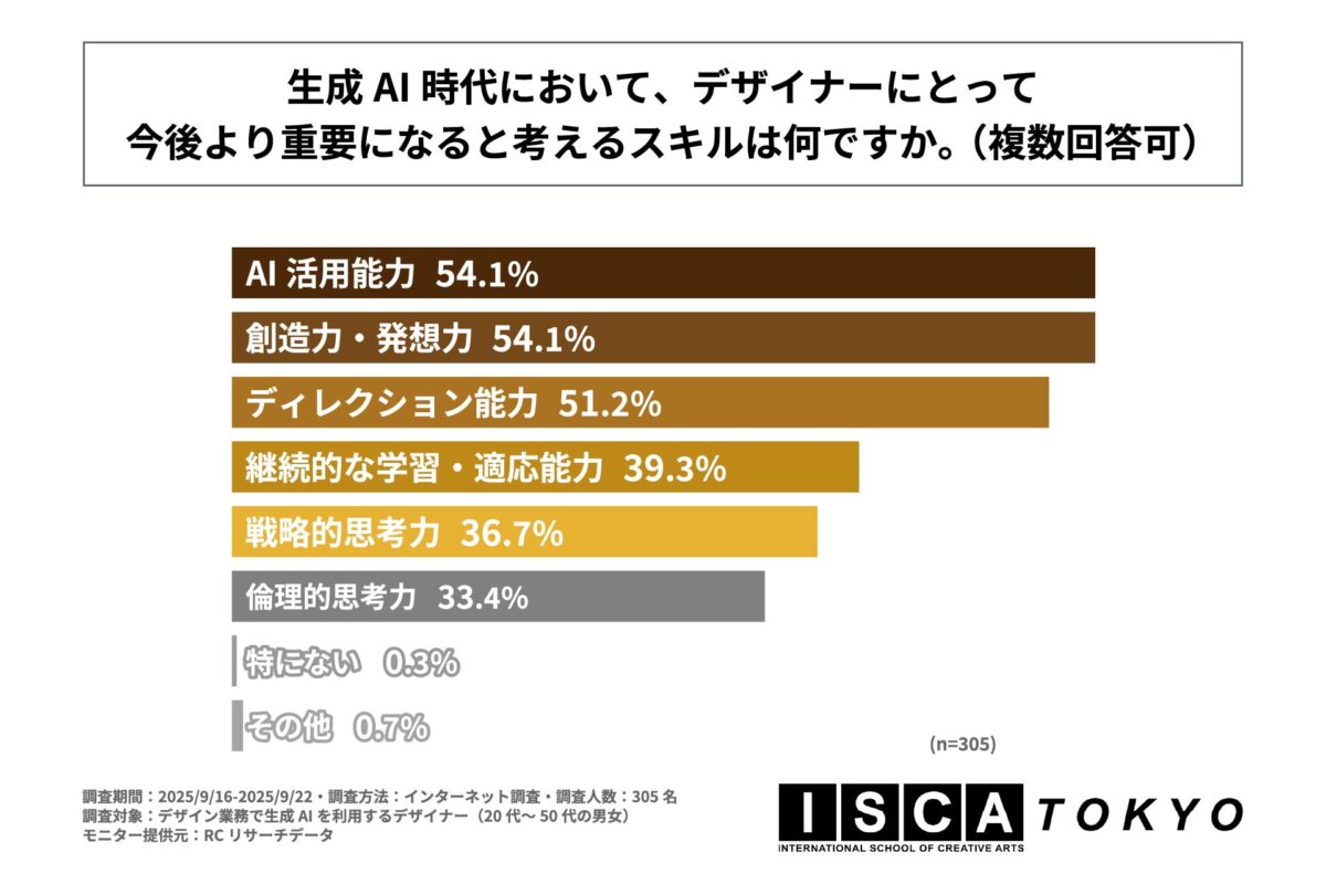 調査の最後に「生成AI時代において、デザイナーにとって今後より重要になると考えるスキル」を尋ねる質問では、1位が同率で「AI活用能力」と「創造力・発想力」でともに54.1%、3位が「ディレクション能力」で51.2%という結果になりました。この結果から、デザイン業務で生成AIを利用するデザイナーは、生成AI時代においてデザイナーにとって今後より重要になるスキルとして「AI活用能力」と「創造力・発想力」が主要なものだと考えていることが報告されています。