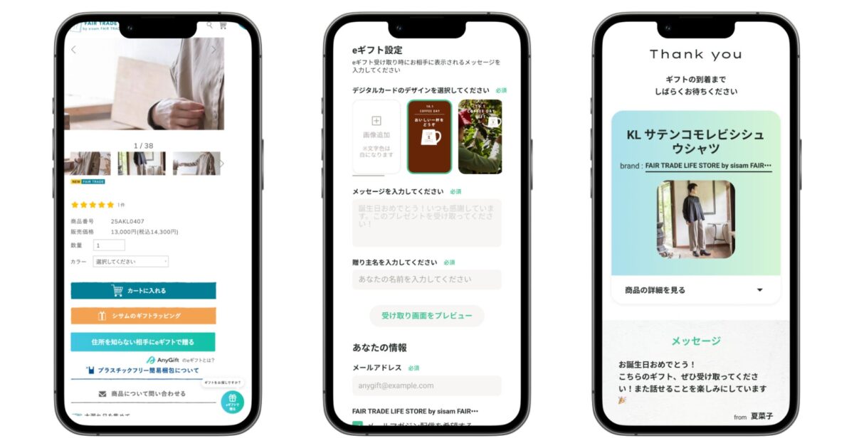 AnyReach株式会社(本社:東京都港区、代表取締役:中島 功之祐)が、フェアトレードブランドを展開する有限会社シサム工房(本社所在地:京都府京都市、代表取締役社長:水野 泰平)の「FAIR TRADE LIFE STORE by sisam FAIR TRADE公式オンラインストア」において、eギフトサービス『AnyGift(エニーギフト)』の提供を開始したことが発表されました。