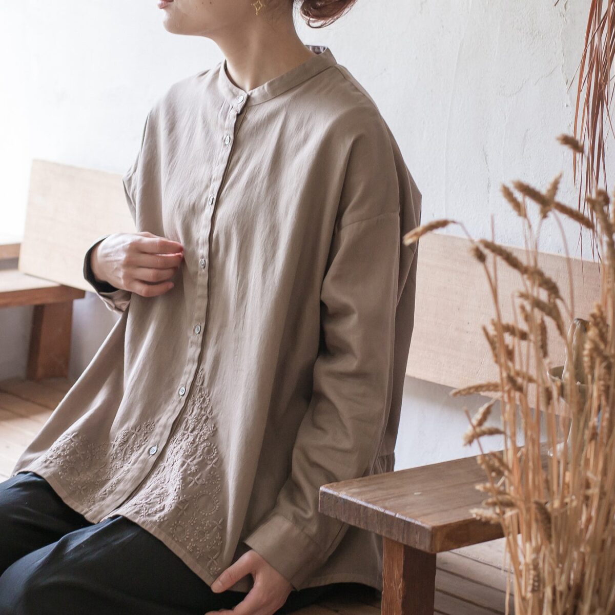 やわらかい光沢が人気のサテンコットン生地で作られた、オケージョンシーンにも使えるリラックスシャツです。木漏れ日を集めたような美しい刺繍のディテールが、サテンの上で優しく光ります。とろりとした着心地と繊細な手仕事を、日々のおしゃれ着にも、特別な日のファッションにも取り入れることができます。