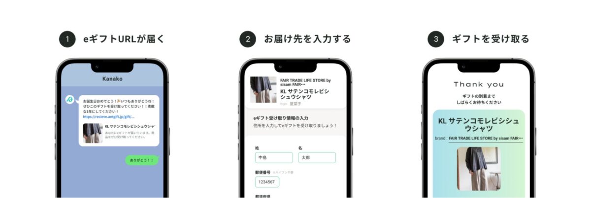 いつもお世話になっている方へのちょっとしたプレゼントや、大切な人への誕生日・記念日のギフト、サプライズをしたいときなど、相手の住所を知らなくても気軽に「FAIR TRADE LIFE STORE by sisam FAIR TRADE」の商品をeギフトとして贈ることができます。URLは注文後すぐに発行されるため、即座に贈ることが可能です。