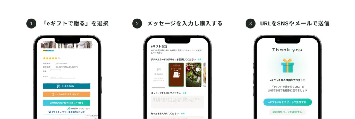 - 購入が完了すると、eギフトの受け取りURLが発行されます。LINEなど各SNSやメールでURLを伝えることでeギフトを贈ることができます。