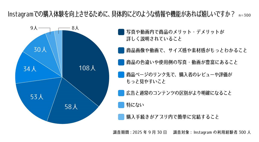 Instagramでの購入体験向上の要望として、「商品のメリット・デメリットが詳しく説明されている」ことが最も多く挙げられました。これは、ユーザーが企業やクリエイターの正直さを求めていることを示しています。