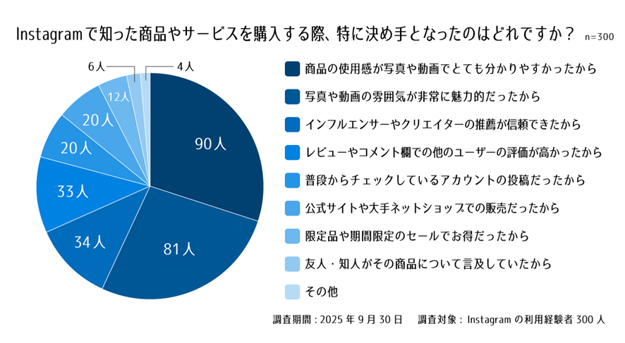 Instagram経由での購買の決め手として、「商品の使用感が写真や動画でわかりやすかった」ことと、「写真や動画の雰囲気が非常に魅力的だった」ことが突出して上位を占めました。これは、ユーザーが商品のリアルなイメージ(具体性)と、ブランドの世界観(共感性)の二点を重視していることを示しています。
