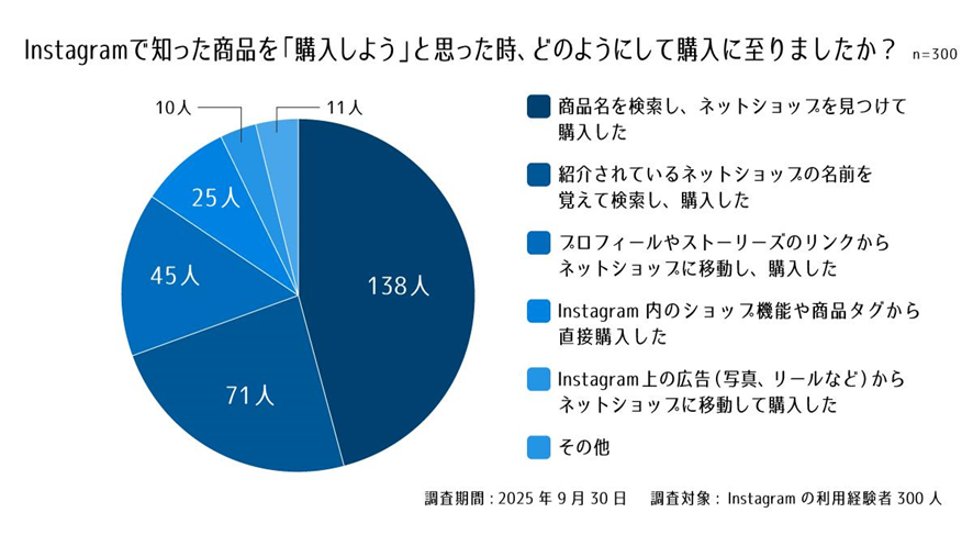 今回の調査から、Instagramは高頻度利用層に支持され、購買のきっかけとなる強力なチャネルであることがわかりました。しかし、ユーザーの多くはアプリ内で衝動買いせず、商品名やショップ名を検索してから購入に至っています。