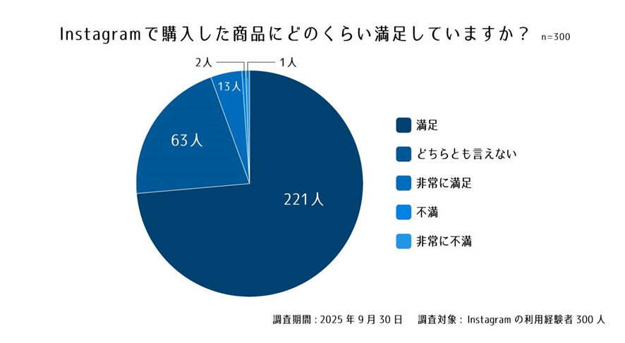 Instagramを通じて商品を購入した消費者のうち、「満足」「非常に満足」を合わせた層が全体の約8割弱を占め、高い満足度にあることが判明しました。これは、Instagramでの訴求力や商品選定が的確であることを示しています。
