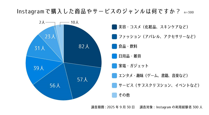Instagram経由で購入された商品は、「美容・コスメ」がトップで、次いで「ファッション」「食品・飲料」がほぼ同率で続きました。これは、Instagramの強みである視覚的な訴求力が、見た目や使用感が重要となるジャンルで、購買に直結していることを示しています。