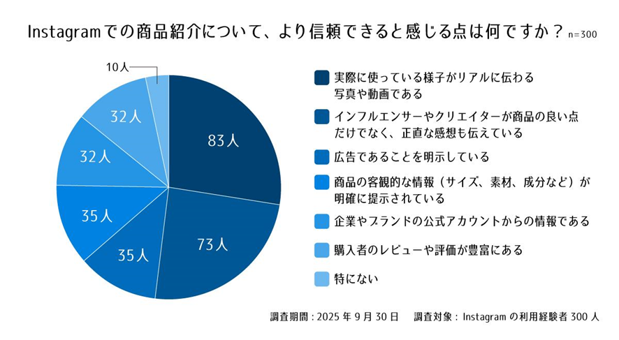 Instagramでの商品紹介で、消費者が最も信頼できると感じるのは「実際に使っている様子がリアルに伝わる写真や動画」でした。次いで、「良い点だけでなく、正直な感想も伝えている」ことが重視されており、ユーザーが広告的な演出よりも、購入後のイメージが湧く「真実味」を求めていることがわかります。
