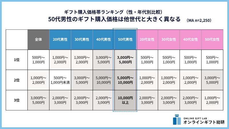 50代男性のソーシャルギフト購入価格は、3,000円以上に偏る。ビジネスとプライベートで使い分け