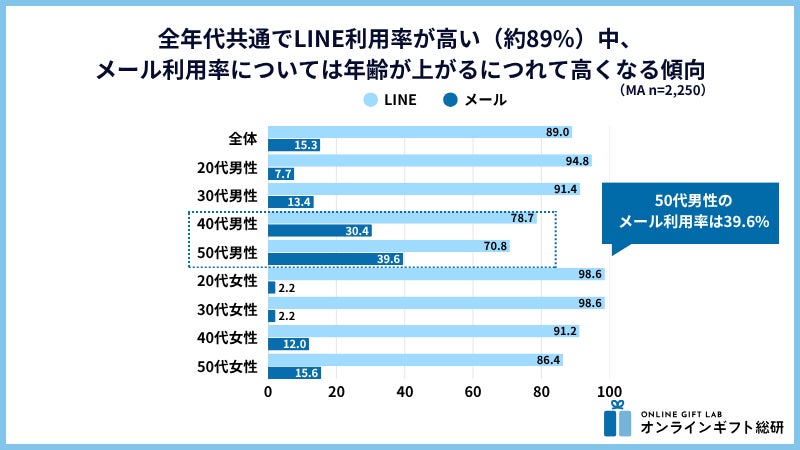 特に50代男性のメール利用率は39.6%で、全体平均の15.3%と大きな開きがあり、興味深い結果となりました。