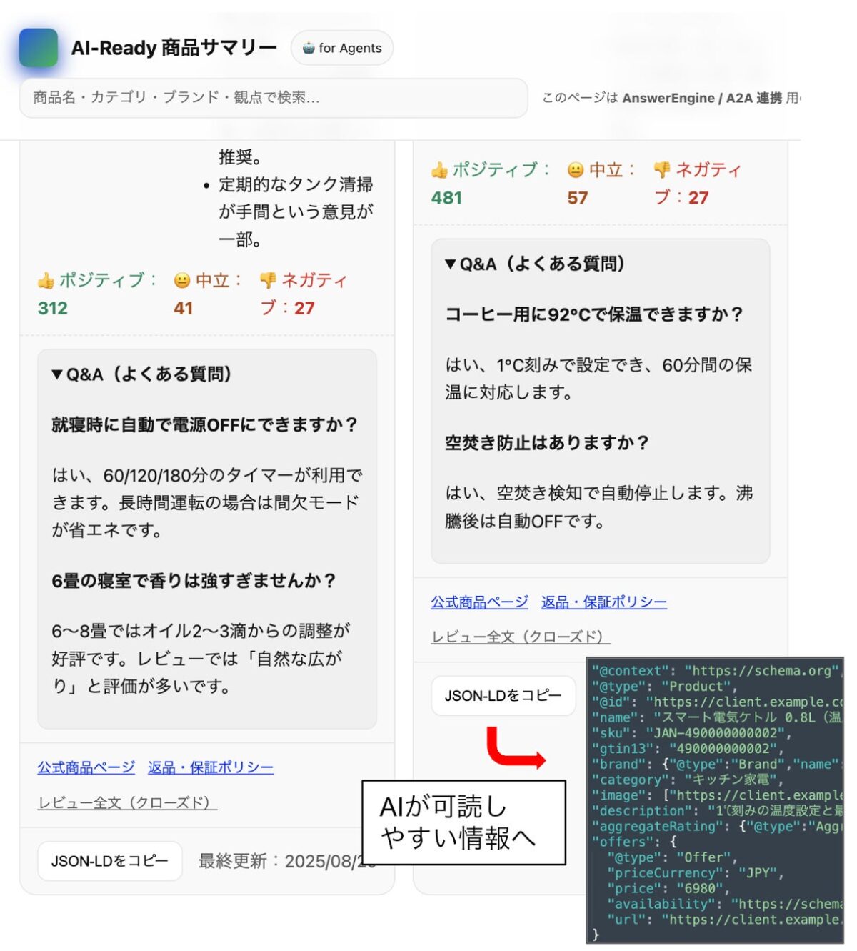 生成されるFAQは、Schema.orgのFAQPage形式で出力されるため、Google検索での強調表示が実現されるとともに、ChatGPTやGeminiなどのAIクローラが理解しやすい形式となります。このことは、従来のSEO戦略に加えて、AEO(Answer Engine Optimization)にも効果があると考えられます。