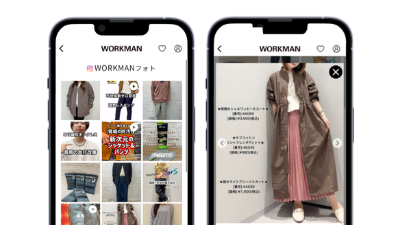 「WORKMANフォト」機能では、気になるコーディネートを選択すると、そのコーディネートで着用されているアイテムの一覧が表示され、各商品ページへスムーズに遷移できるようになっています。これにより、直感的かつ快適な購買体験が可能になりました。