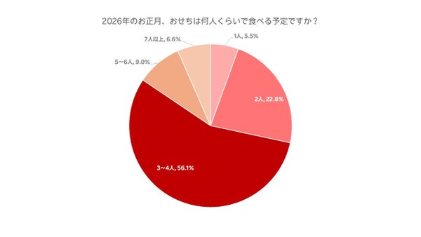 2026年のおせちを食べる人数は、「3~4人」が5割以上、次いで「1~2人」が約3割